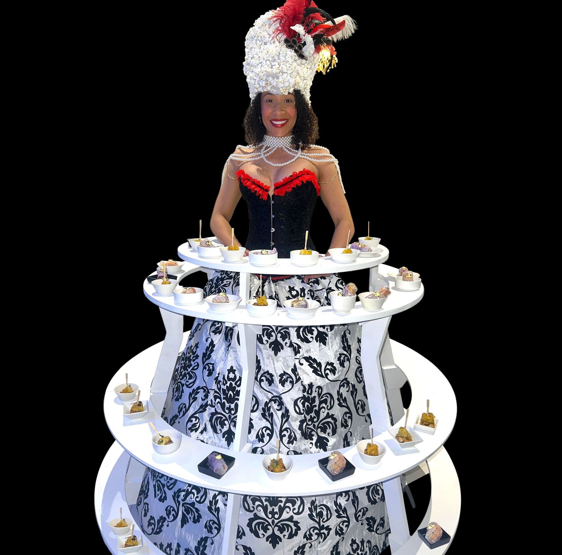Experience seamless service with a stunning hostess elegantly wearing a roaming tiered tray filled with an array of delectable canapés arranged at varying levels.