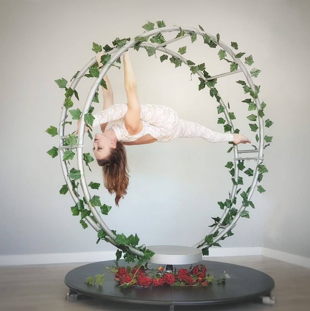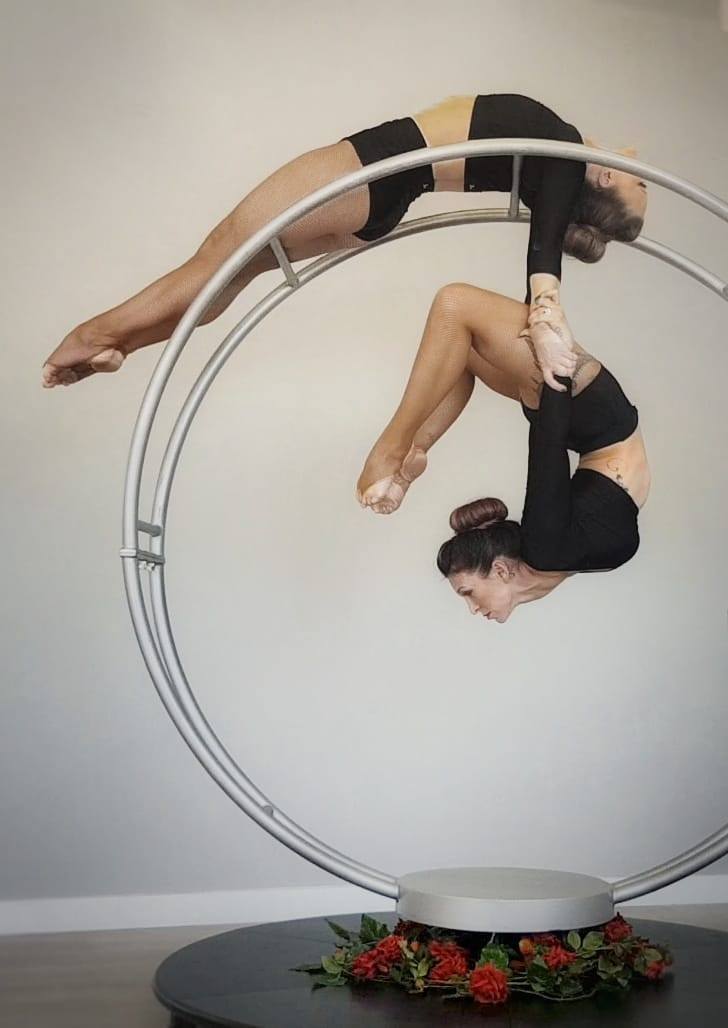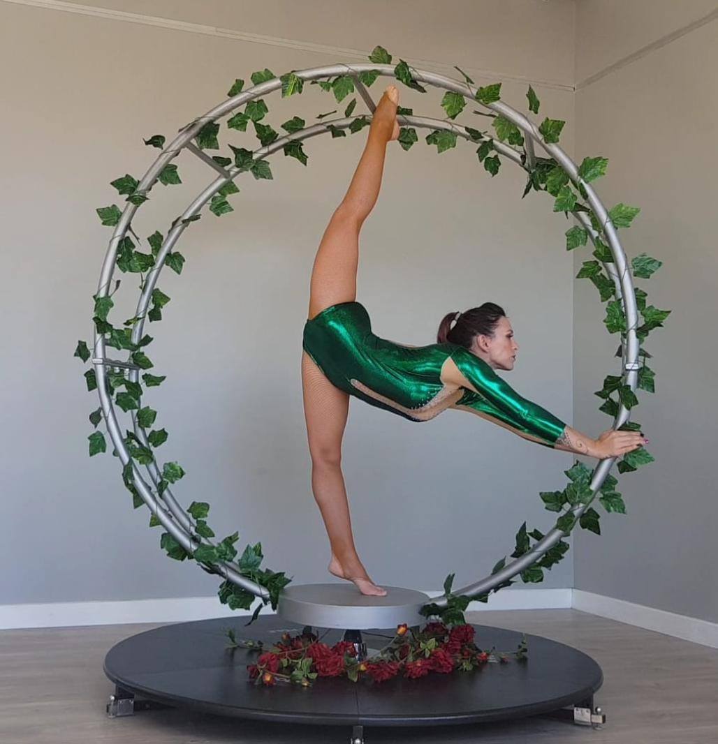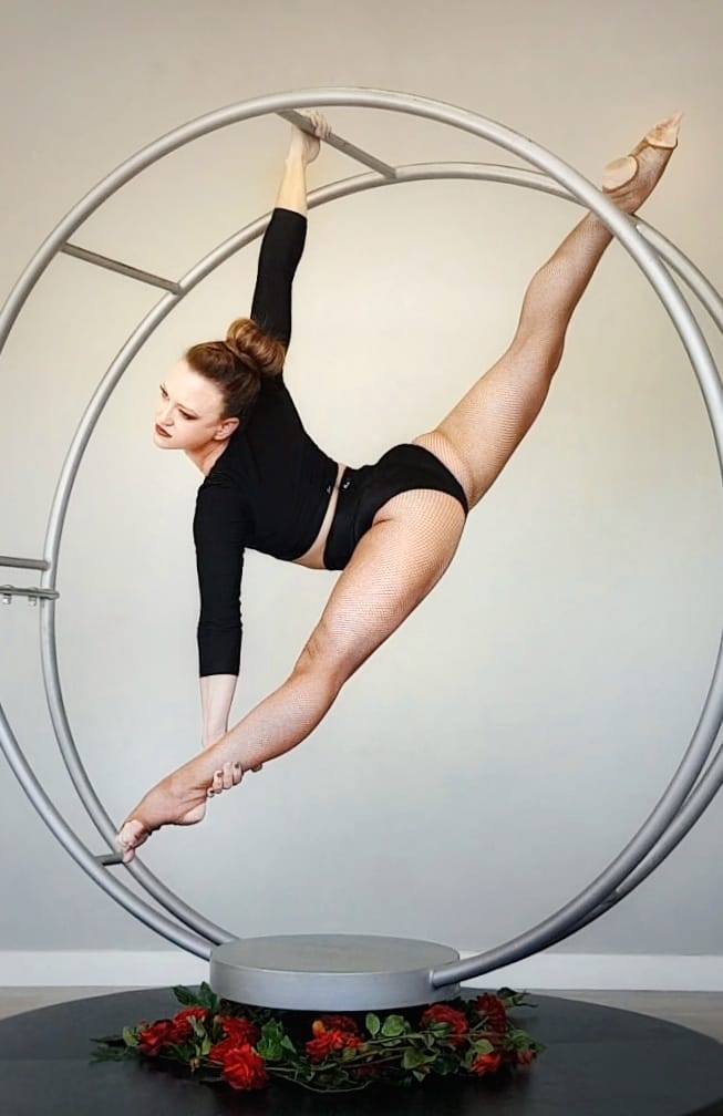 This specialty act highlights the gymnast’s precise control and fluid movements as the sphere rotates, creating a mesmerizing display of balance, agility, and artistic expression.