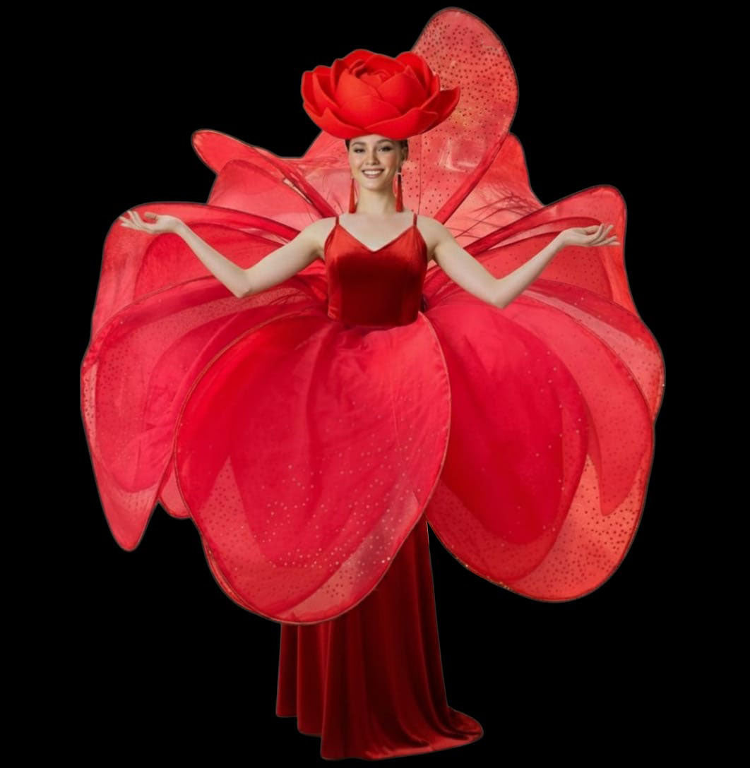 Ladies dressed in elegant long gowns adorned with large, vibrant flower outfits captivate every event they attend.